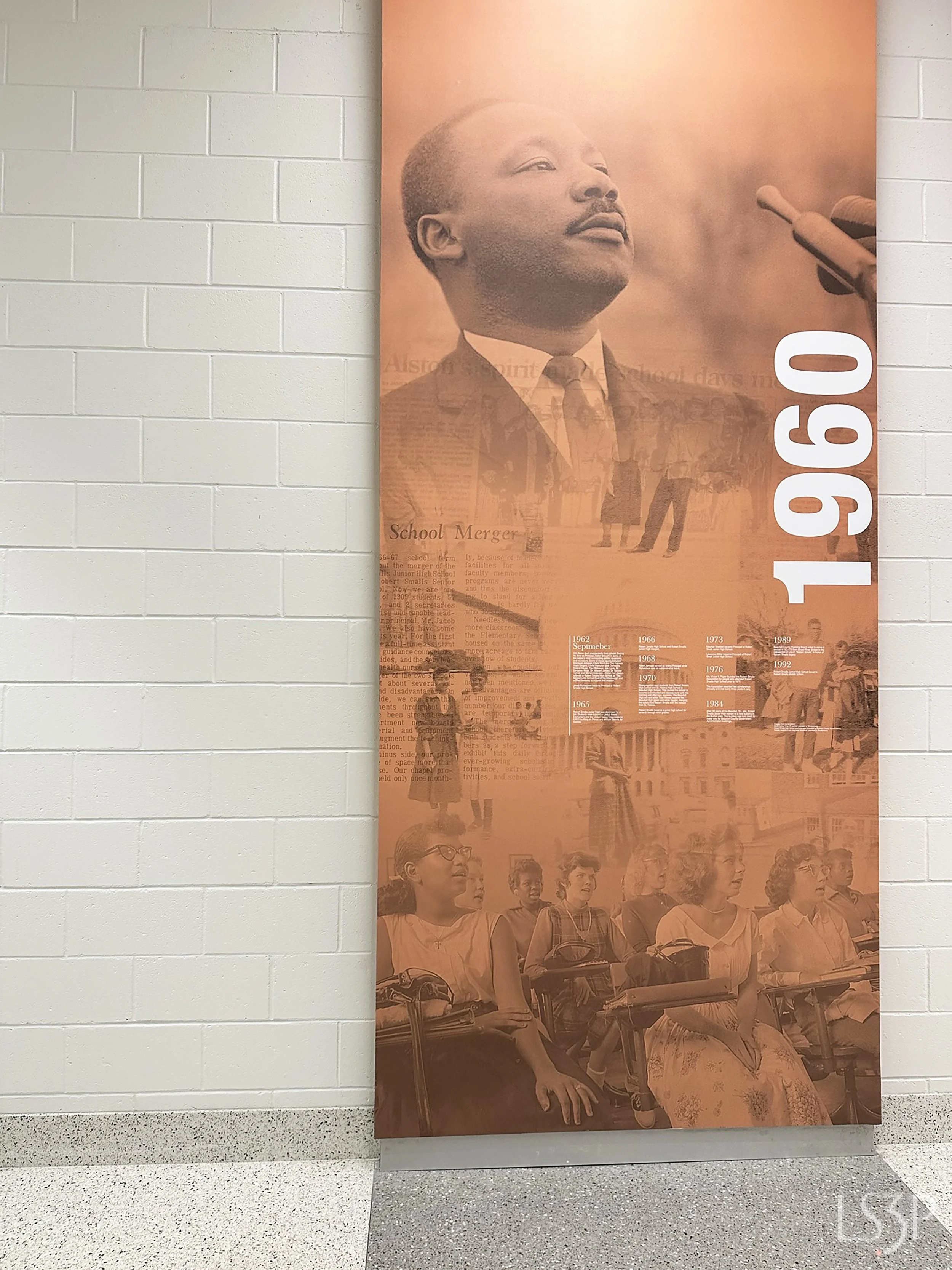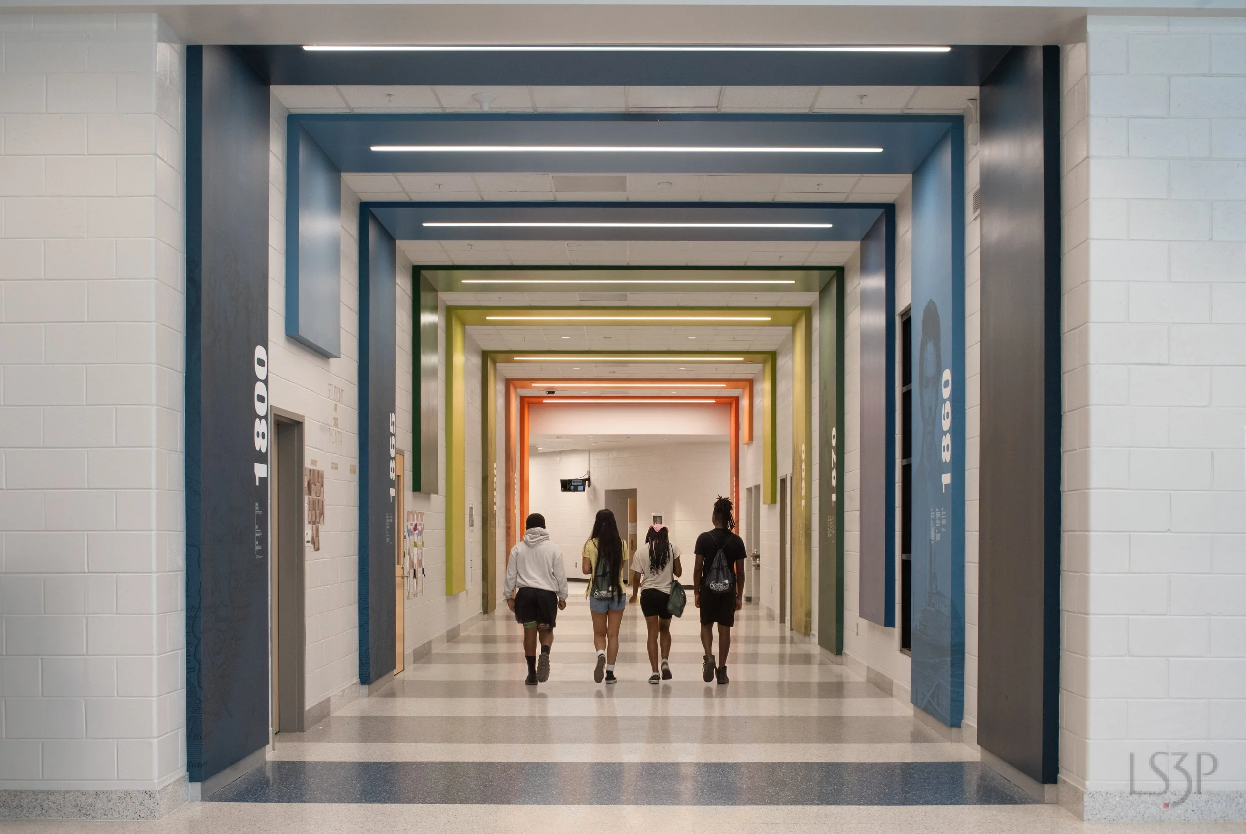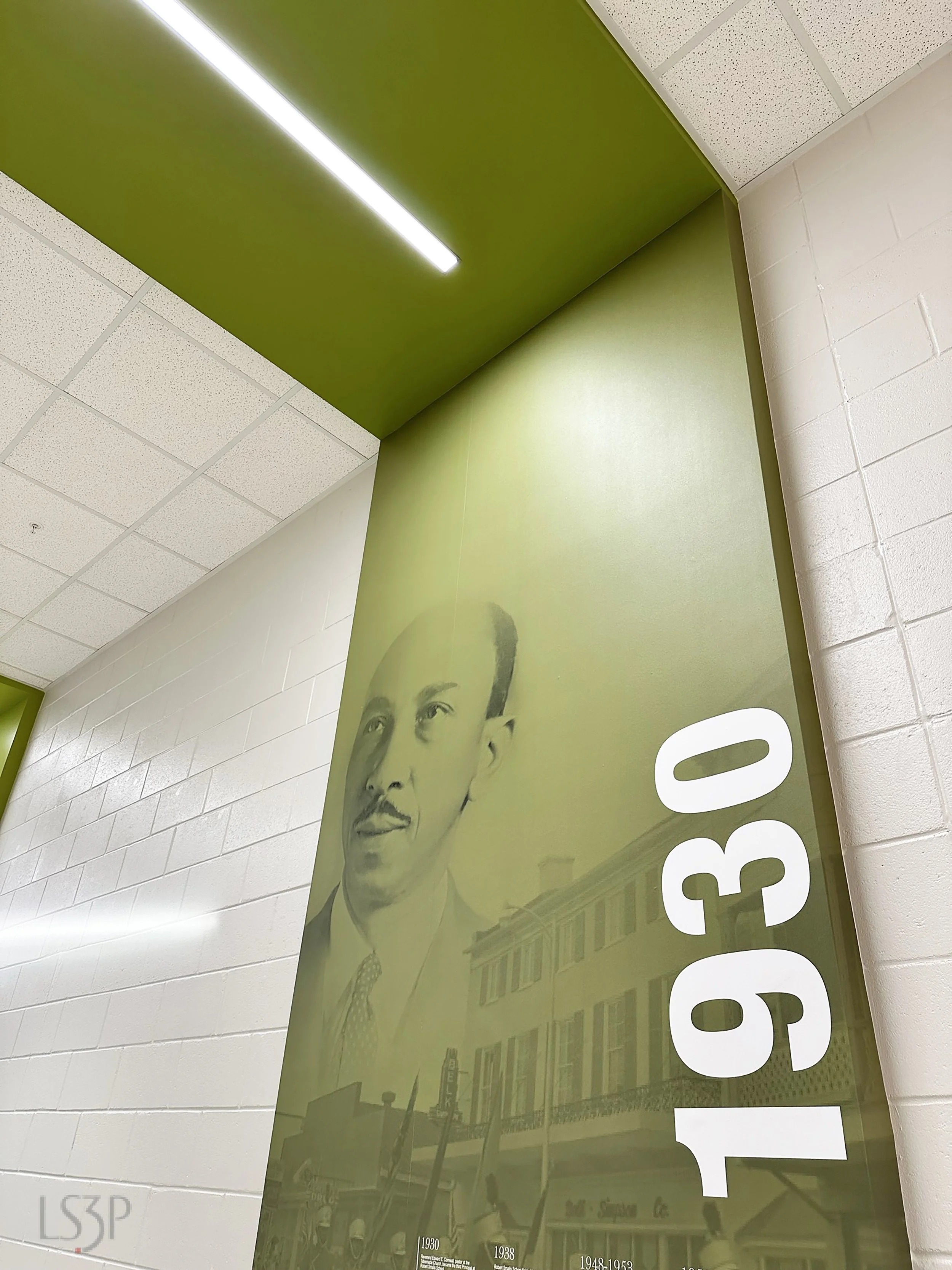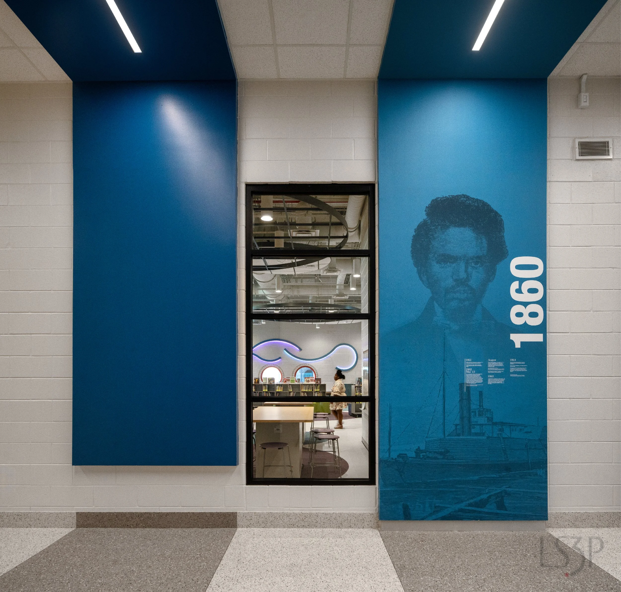 The team faced the challenge of immersing the environment with the history and advocacy of Robert Smalls and the school, transcending their dedication to education by addressing the significance of their actions amid civil and social unrest in America. In line with the principle of using the building as a teaching tool, the corridor space was transformed with a sequence of eight portals forming a visual timeline. The intentional layering of these portals onto ceilings and corresponding walls emerged as a strategic solution to effectively engage users with the historical content.