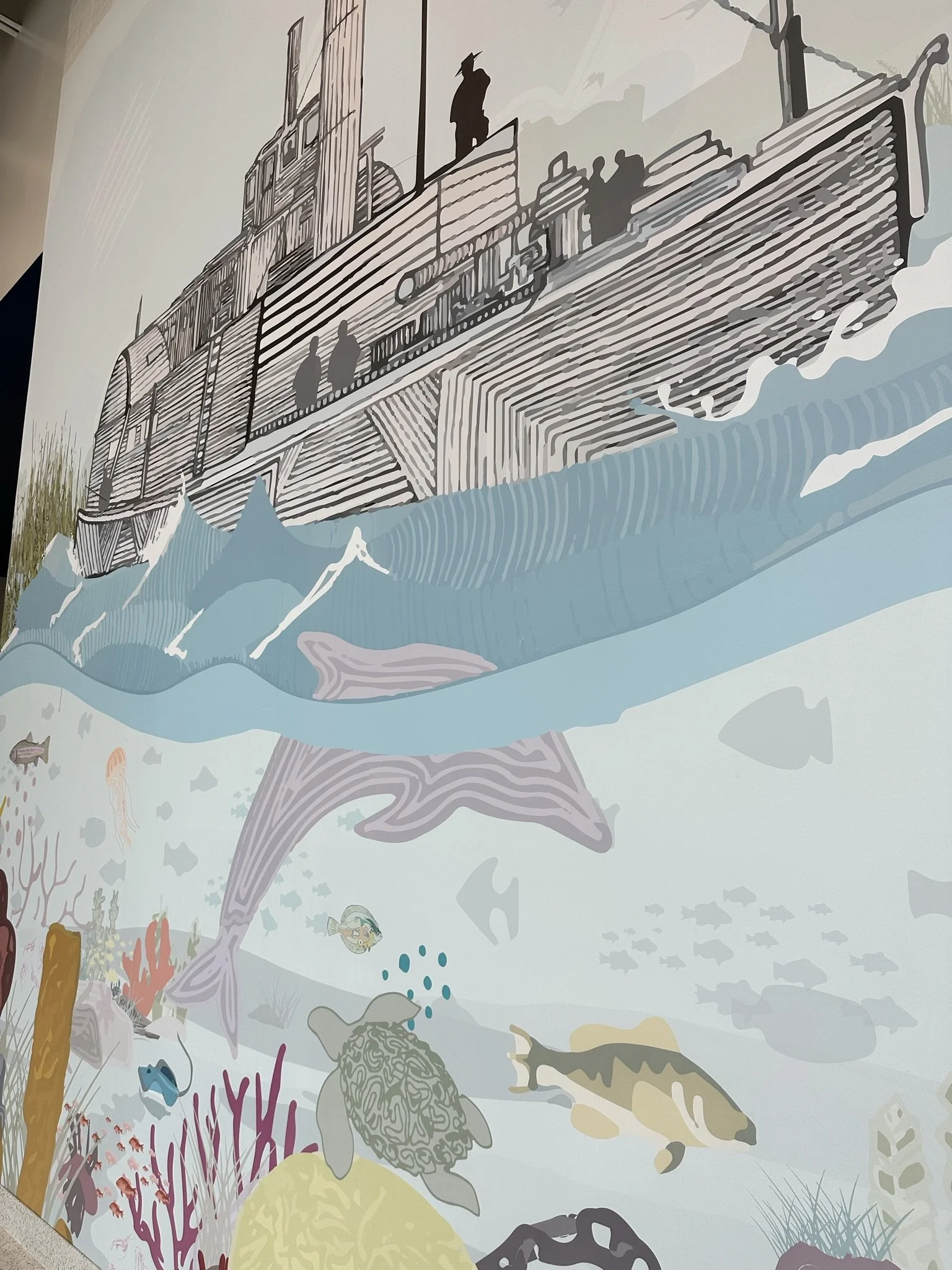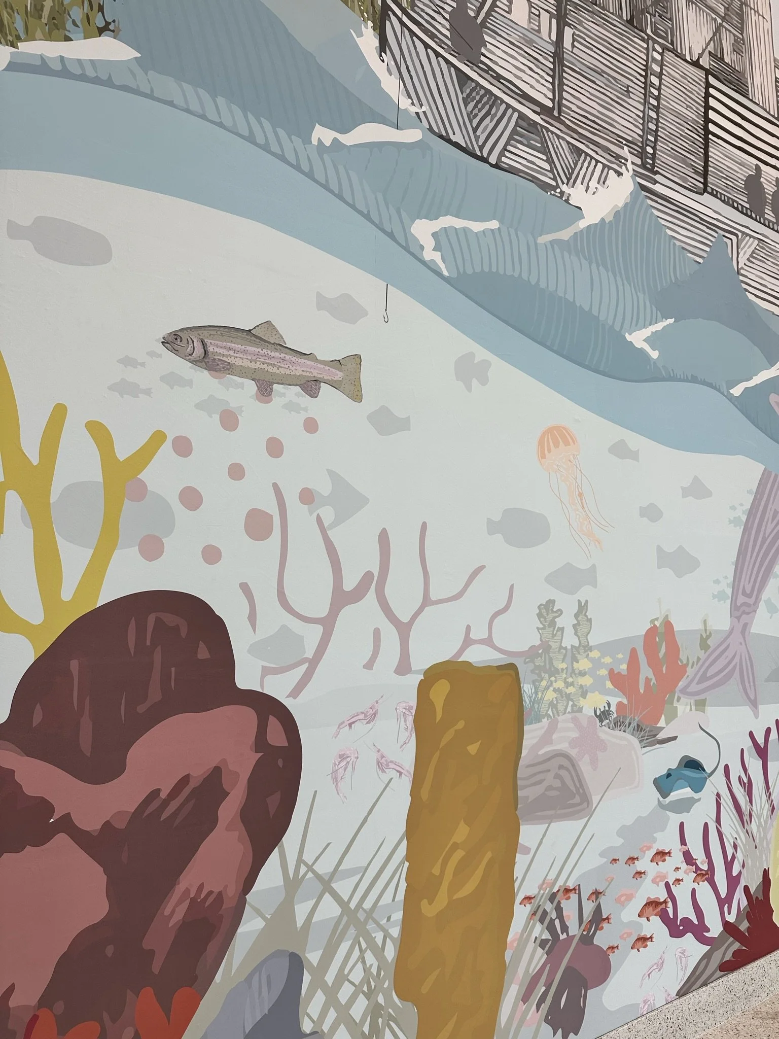 The soft color palette coupled with the illustrative movement within the mural creates an ideal backdrop for the bright, monumental stair to take center stage. The design cleverly transforms the building environment into a learning tool by seamlessly weaving local ecology into the Planter Mural. Beyond aesthetic appeal, this integration responds to the science curriculum, fostering moments of discovery as students find sea life within the art.