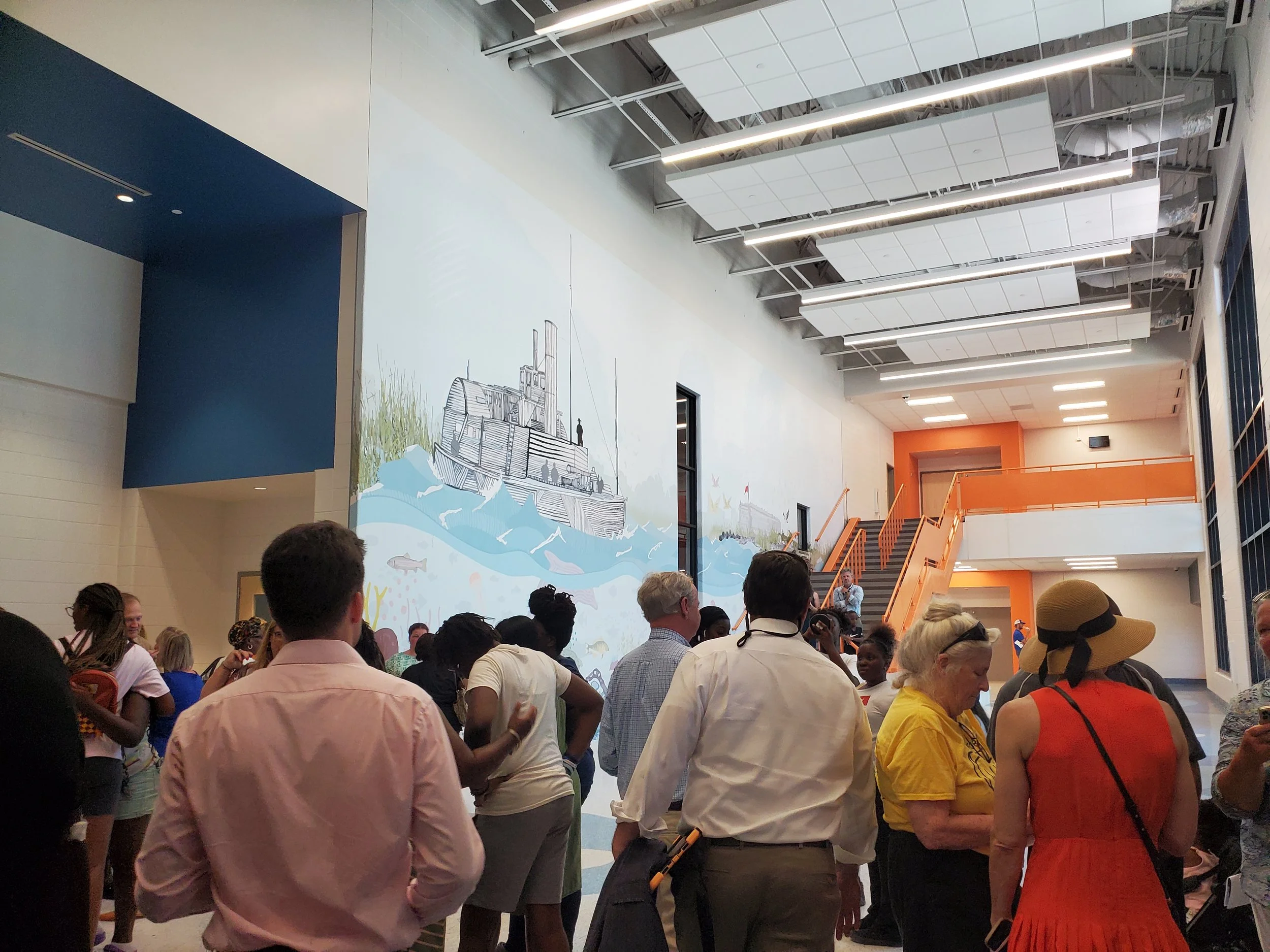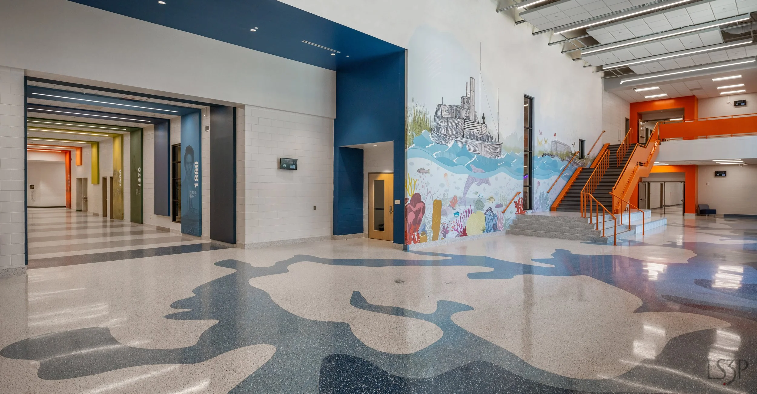 The team envisioned an entry experience for students and the community that is steeped in the rich history of Robert Smalls. Such an experience is achieved through a grand Planter Mural in the main lobby. The mural serves as a vibrant celebration of Robert Smalls' life, depicted through a hand-drawn illustration narrating the daring escape of Smalls and enslaved men capturing the Planter Ship in Charleston Harbor.